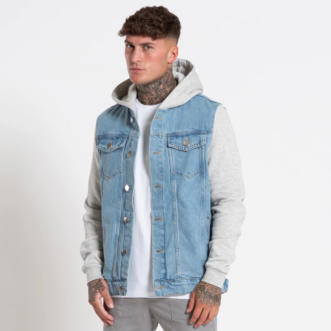 Slimย fit denim shirt jacketย in light blueย denim. Featuring contrast sleeves & hood, quad pocket design, branded metal buttonsย and straight hem finish.