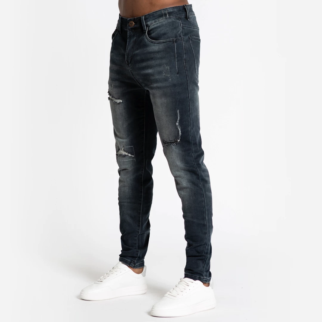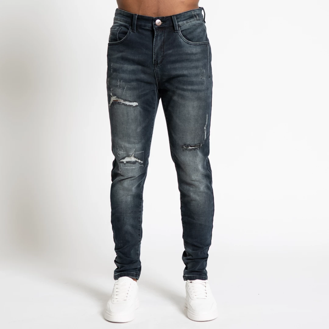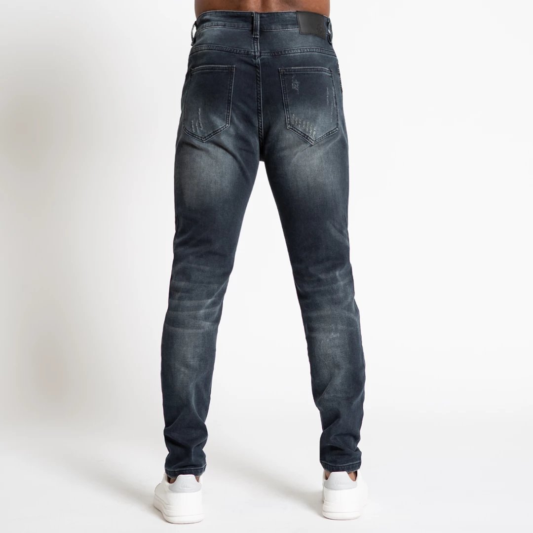 Dark wash stretch denim in a relaxed fit, designed to fit looser round the leg. Distressed detailing on both legs, Zip-fly and rear faux leather waist patch.
