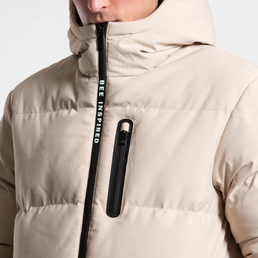 Hooded longline puffer jacket in sand, designed to keep you warm throughout the winter months. Featuring; Bee Inspired taping on the zipper, elasticated cuffs, double pocket design and branded zip pulls.