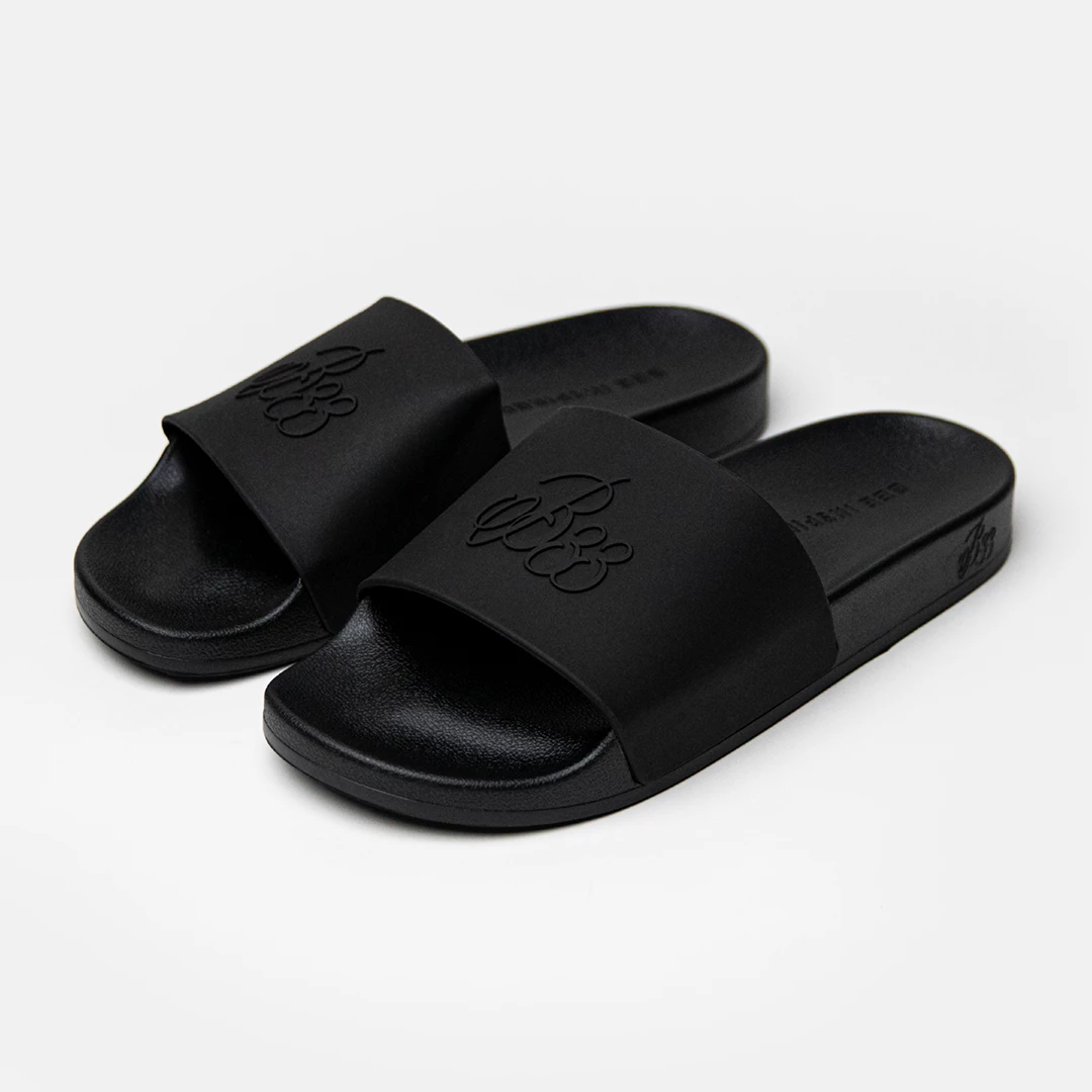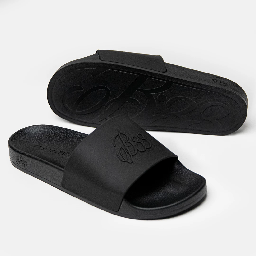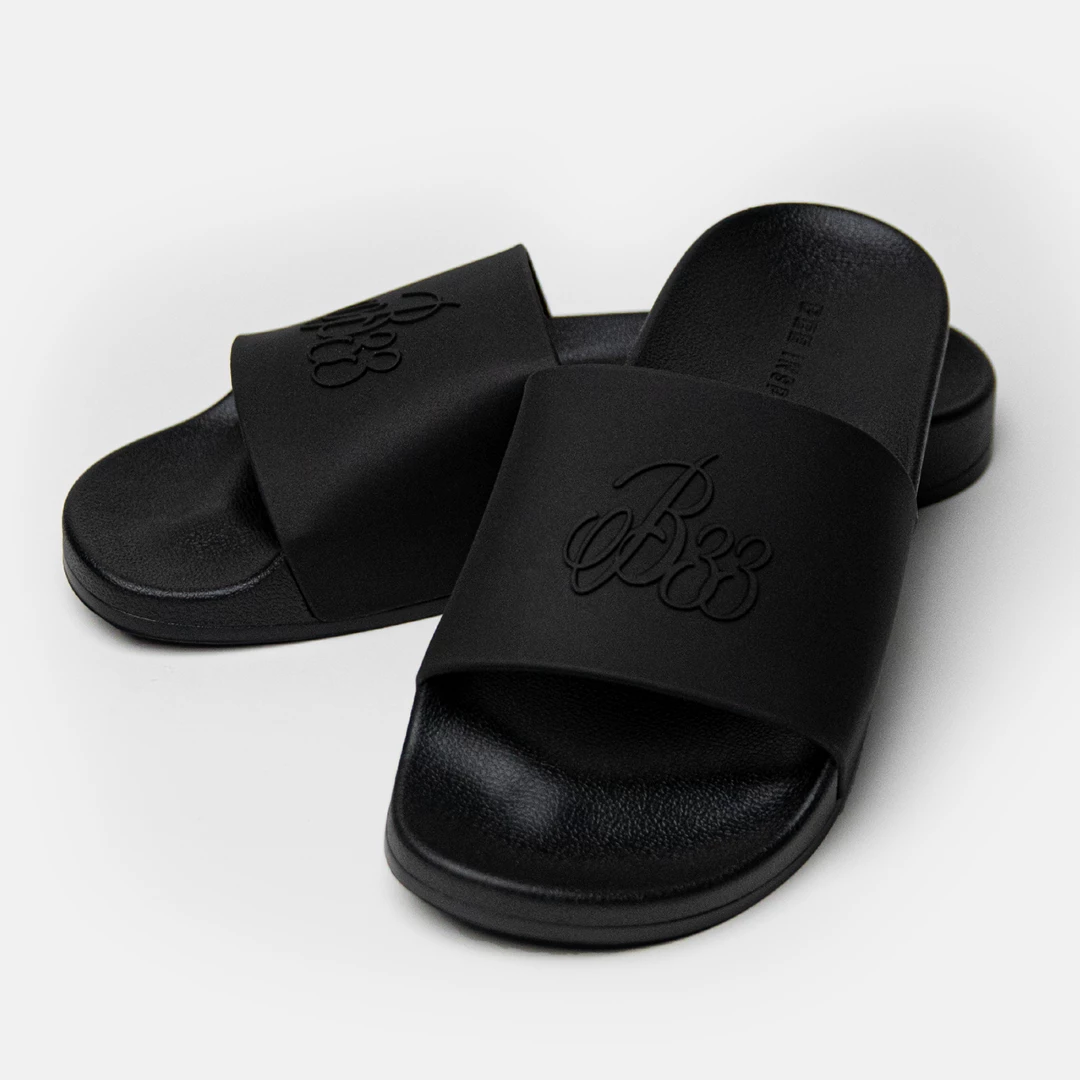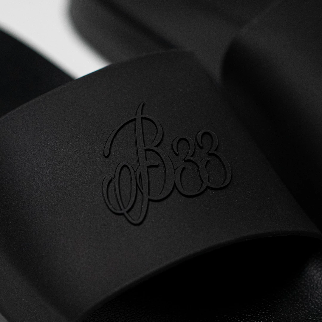 The Classic Sliders feature a smooth matte black rubber strap accented with B33 3D logo branding for a high-end look.