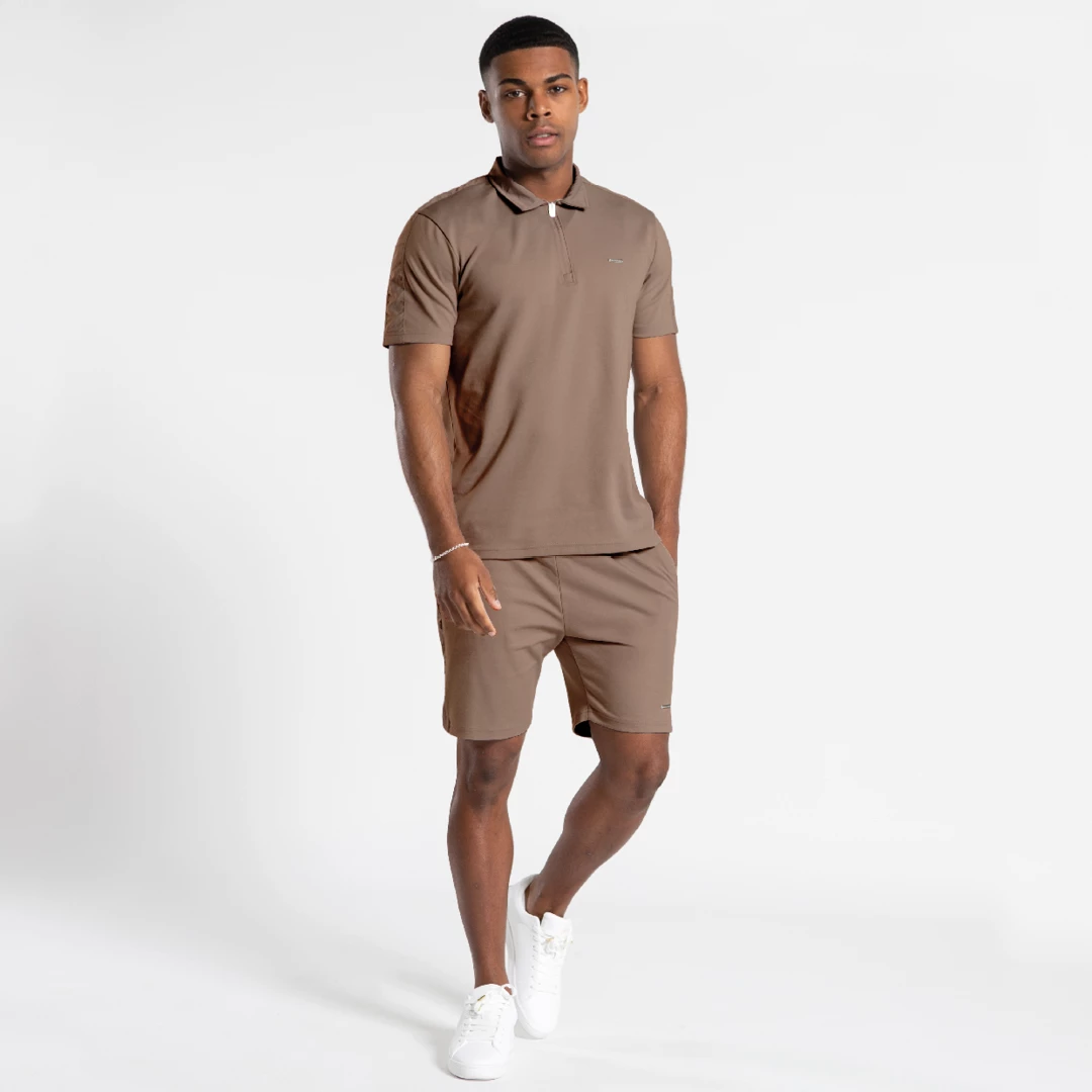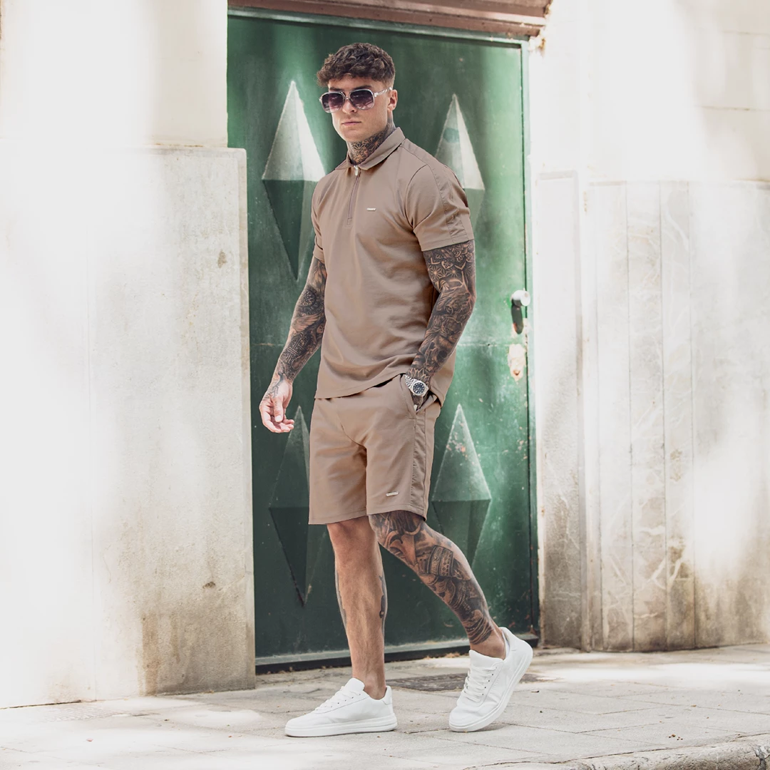 Premium fabric polo shirt inΒ taupe, featuring an athletic style fit. Including a zip upΒ polo collar detail, panelling detail at the shoulders, and a brandedΒ metal label at theΒ chest with aΒ straight hem finish.