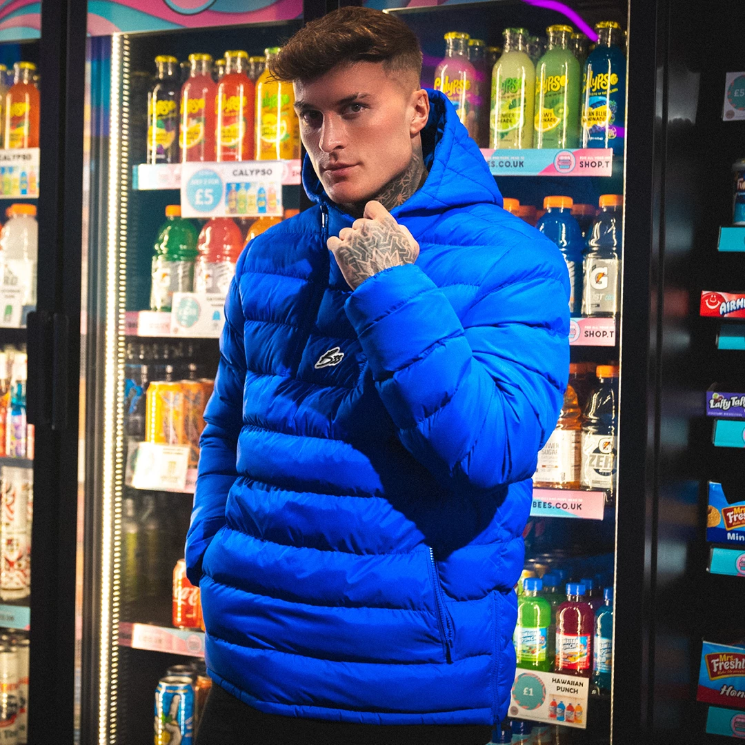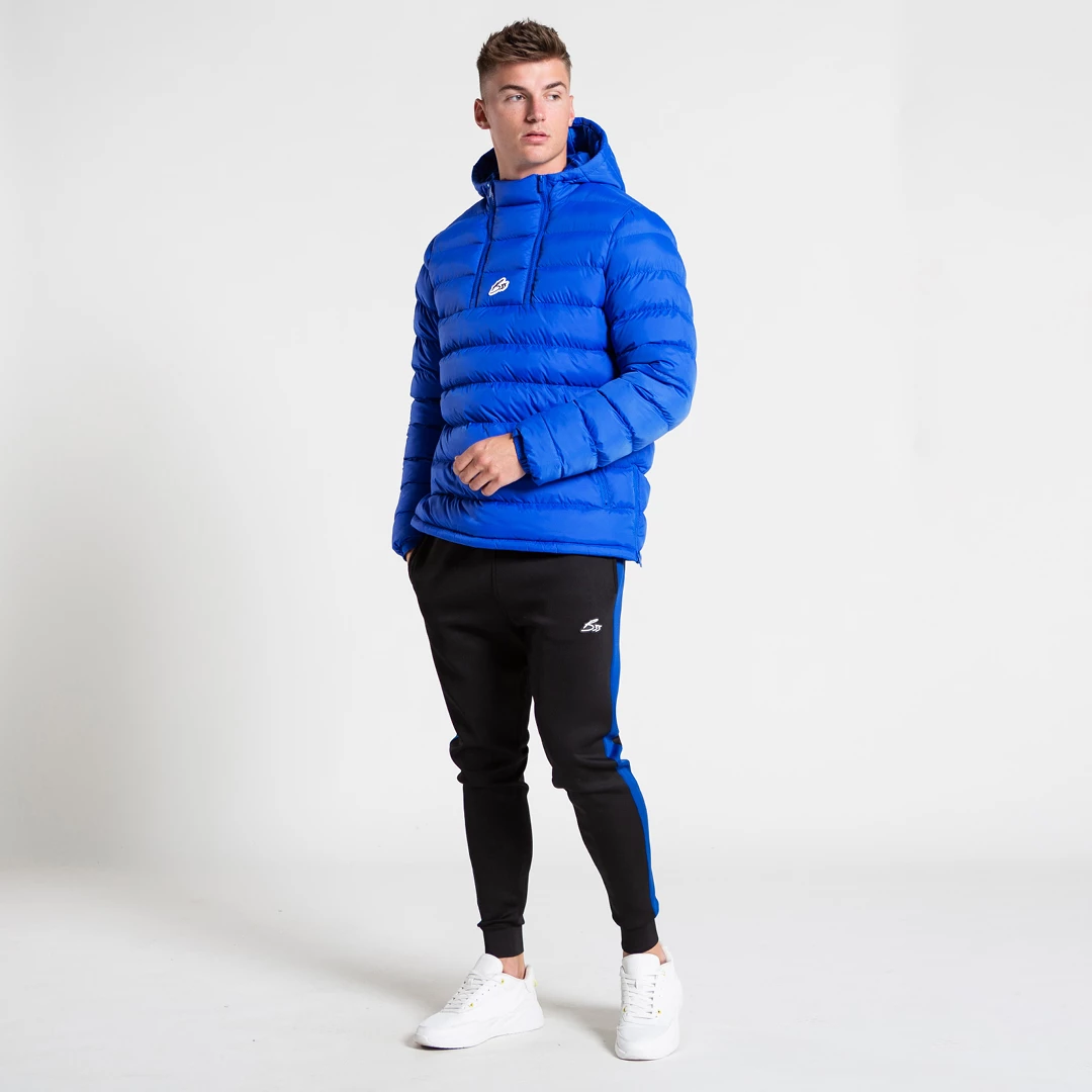 Overhead puffer jacket in blue in an athletic fit. Featuring a double zip quarter zip design, double pockets, with our B33 script logo in the centre chest.