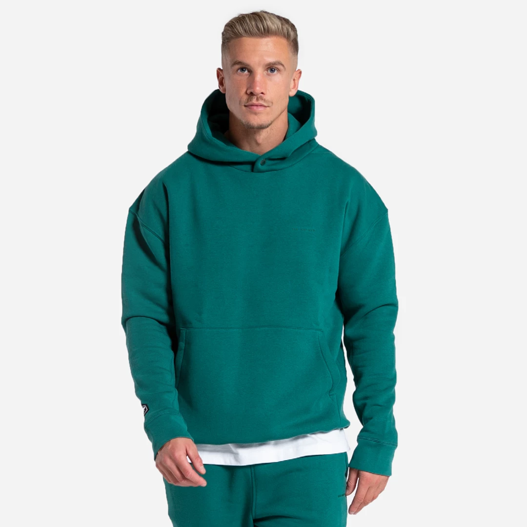 Overhead Relaxed Fit Hoodie in mid green, with stretch fit cuffs and hem, kanga pocket, and hooded with a branded popper. Crafted from sustainably sourced cotton. Featuring our tonal linear Bee Inspired logo on the chest.