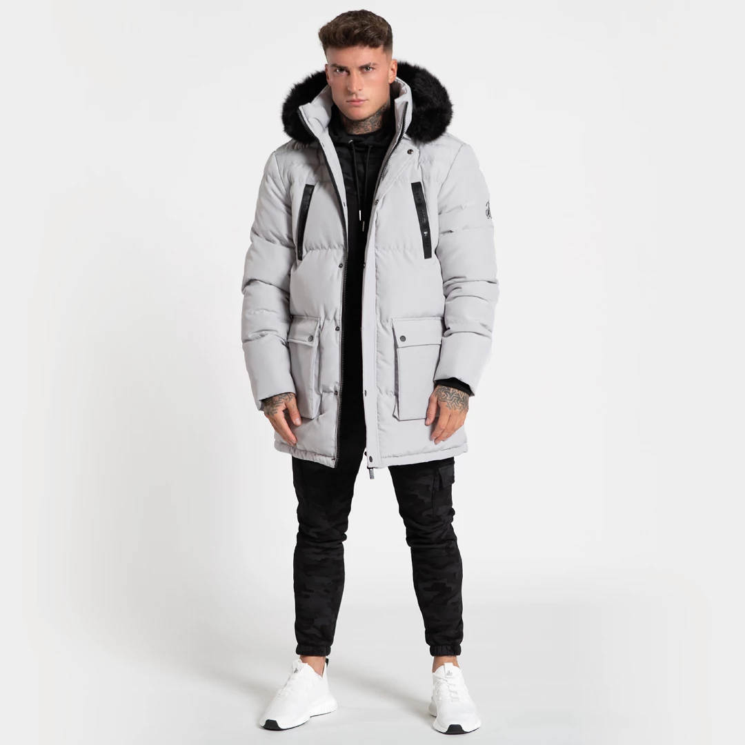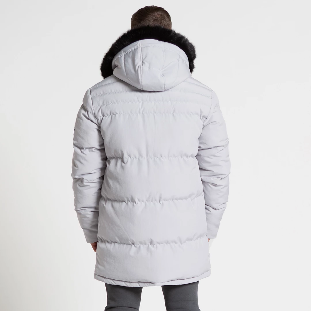 Longline hoodedΒ puffer jacket in grey, designed to keep you warm throughout the winter months. Featuring; double lined hood with high neck and fur, double lined padding, quad pocket design with Bee Inspired taping on the upper pockets, our iconic B33 embroidery on the left arm and finished with B33 branded zip pulls and buttons.