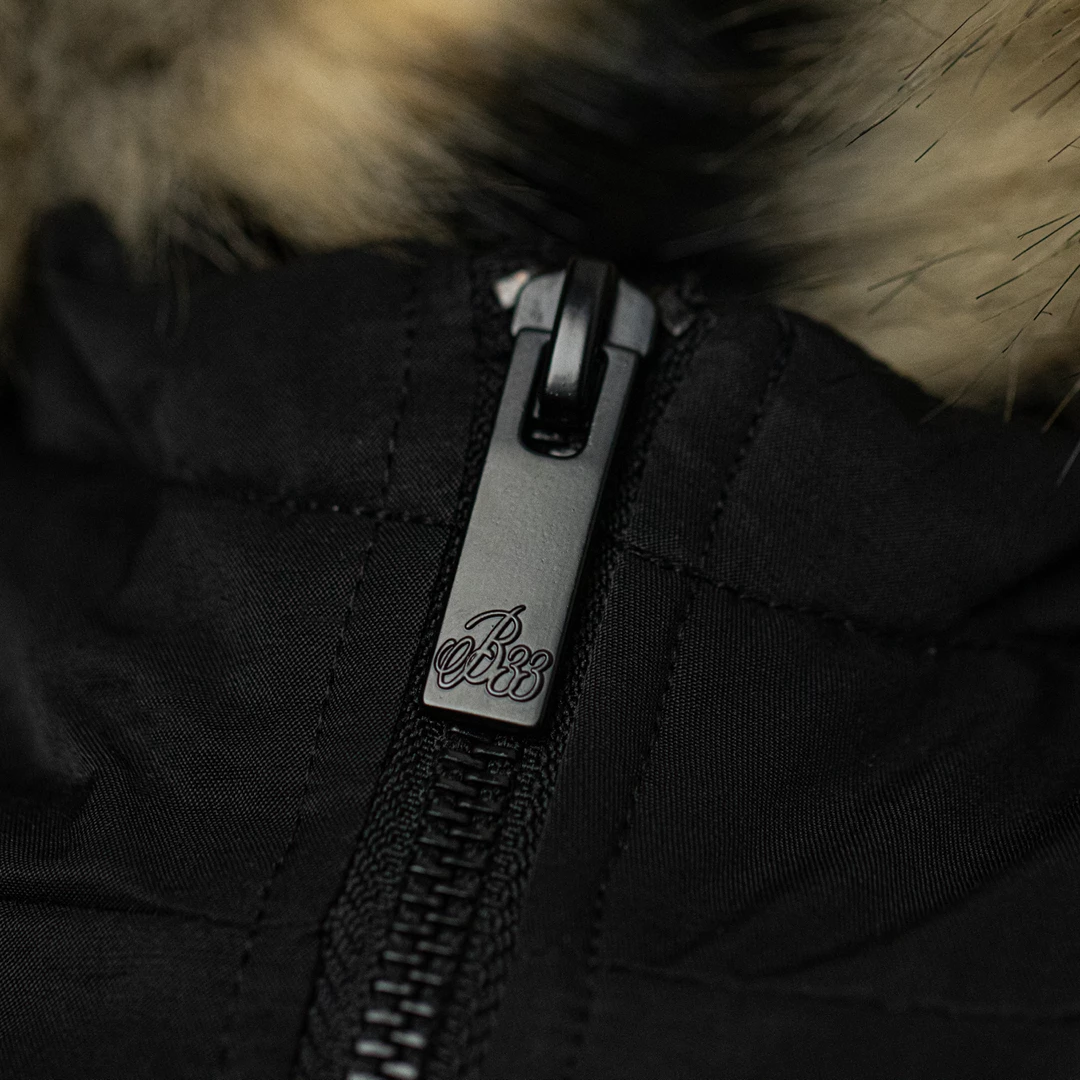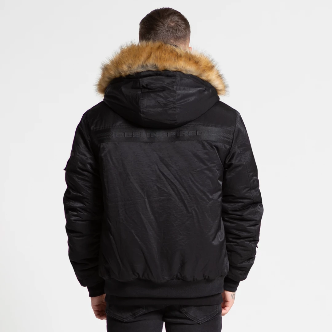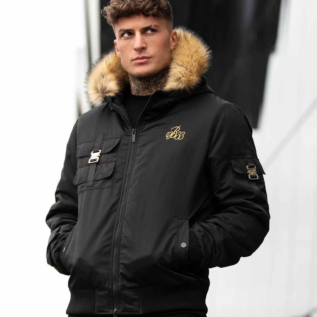 Athletic style bomber jacket with fur hood in black, your perfect jacket for winter with additional padding. Featuring pockets with gold buckle clips on the right chest and and left sleeve, custom branded gold zip pulls, twin pocket design with branded poppers and elasticated hem and cuffs, complete with our iconic embroidery on the left chest in gold and a Bee Inspired taping across the black.