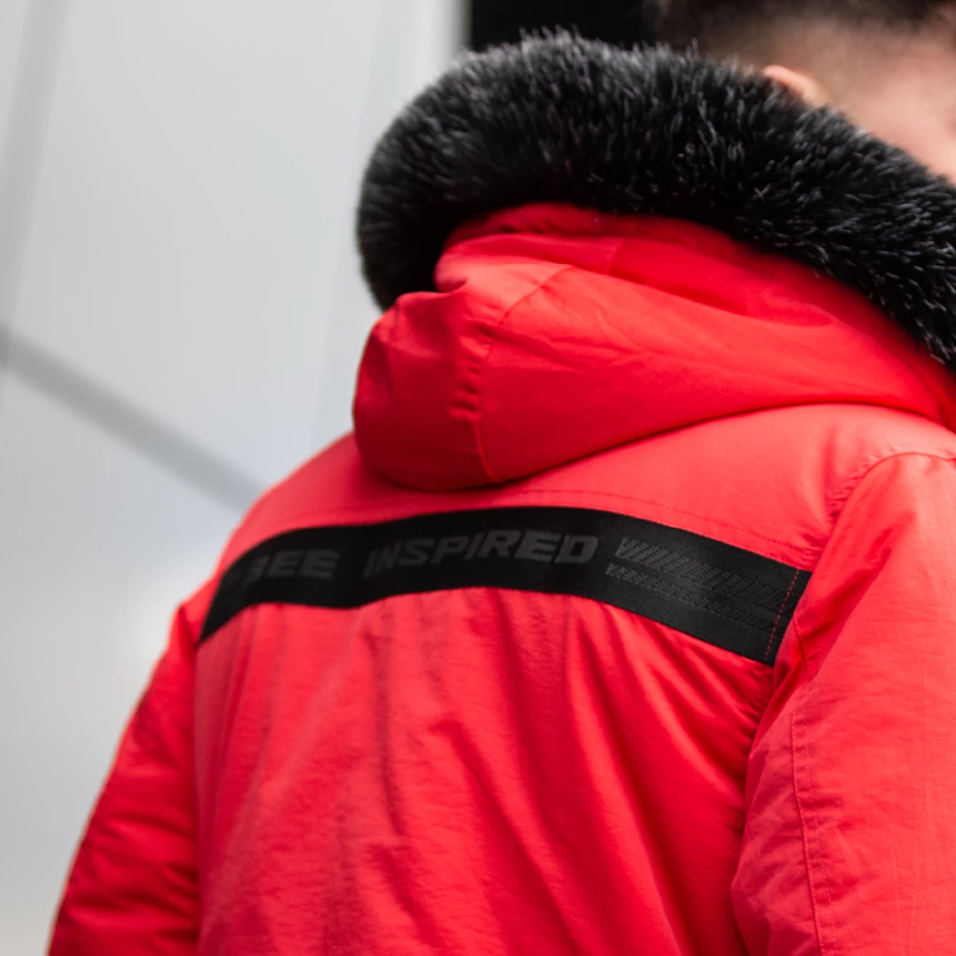 Athletic style bomber jacket with fur hood in red, your perfect jacket for winter with additional padding. Featuring pockets withΒ black buckle clips on the right chest and and left sleeve, custom branded zip pulls, twin pocket design with branded poppers and elasticated hem and cuffs, complete with our iconic embroidery on the left chest and a Bee Inspired taping across the black.
