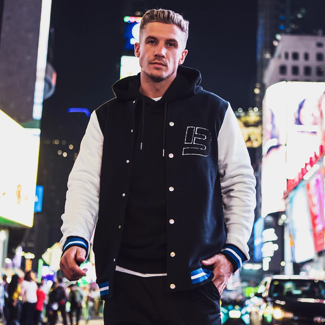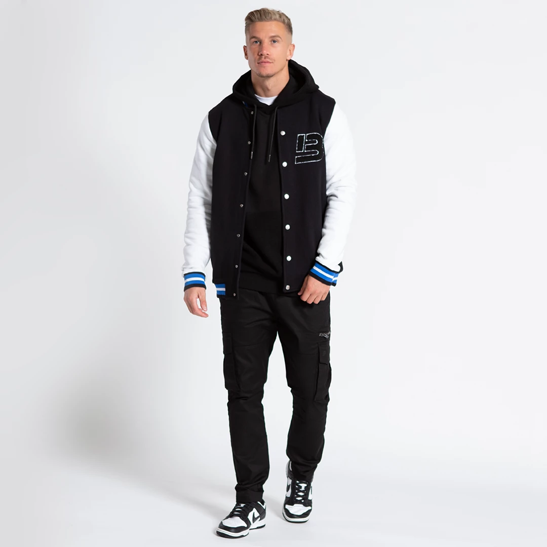 Be bang on trend with our athletic, college style varsity bomber jacket in black. Featuring contrasting white sleeves, elasticated hem and cuffs with blue and white detailing, and silver popper buttons.Β Branded with our new standout ‘B’ monogram on the chest.