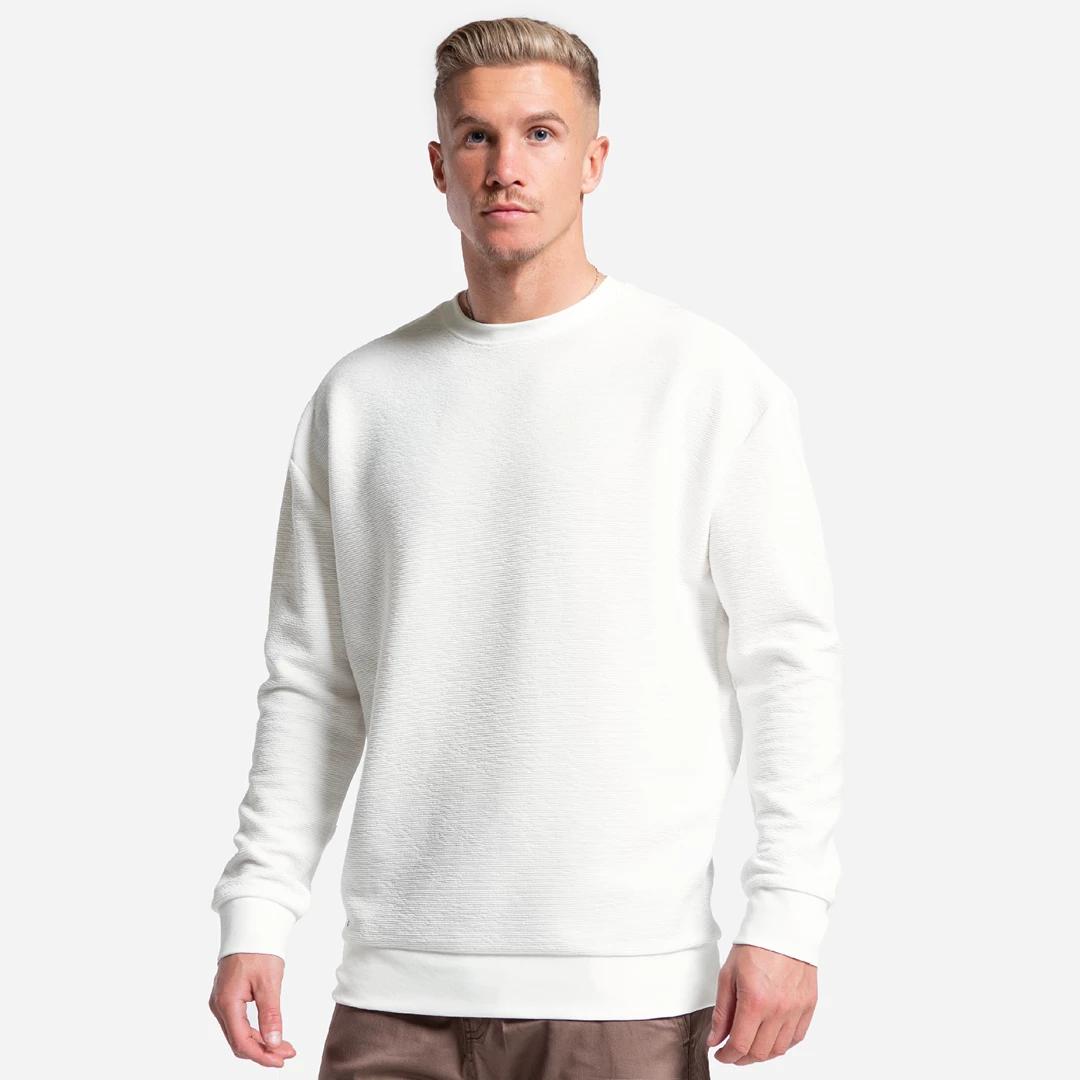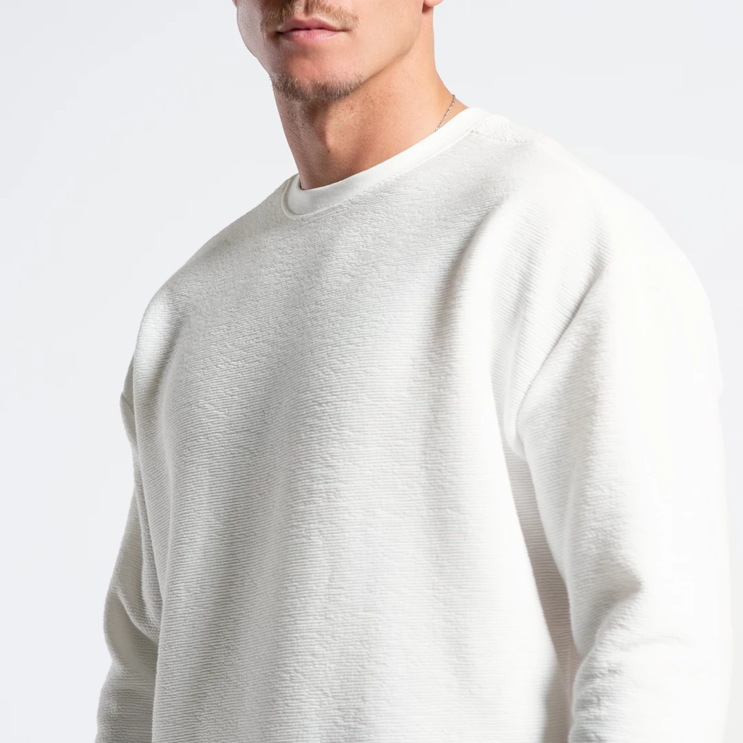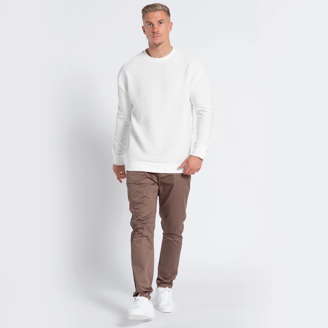 Our Rowe crew sweater in ivory is made from soft sweatshirt fabric. It is in our bestselling regular fit. Customised with a crew neck and thick ribbed stretch cuffs. Subtly branded with our metal tag at the hem.