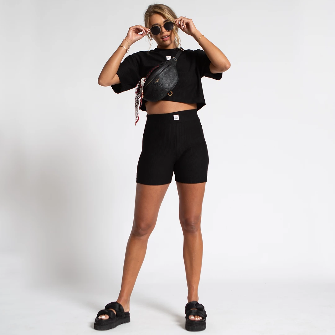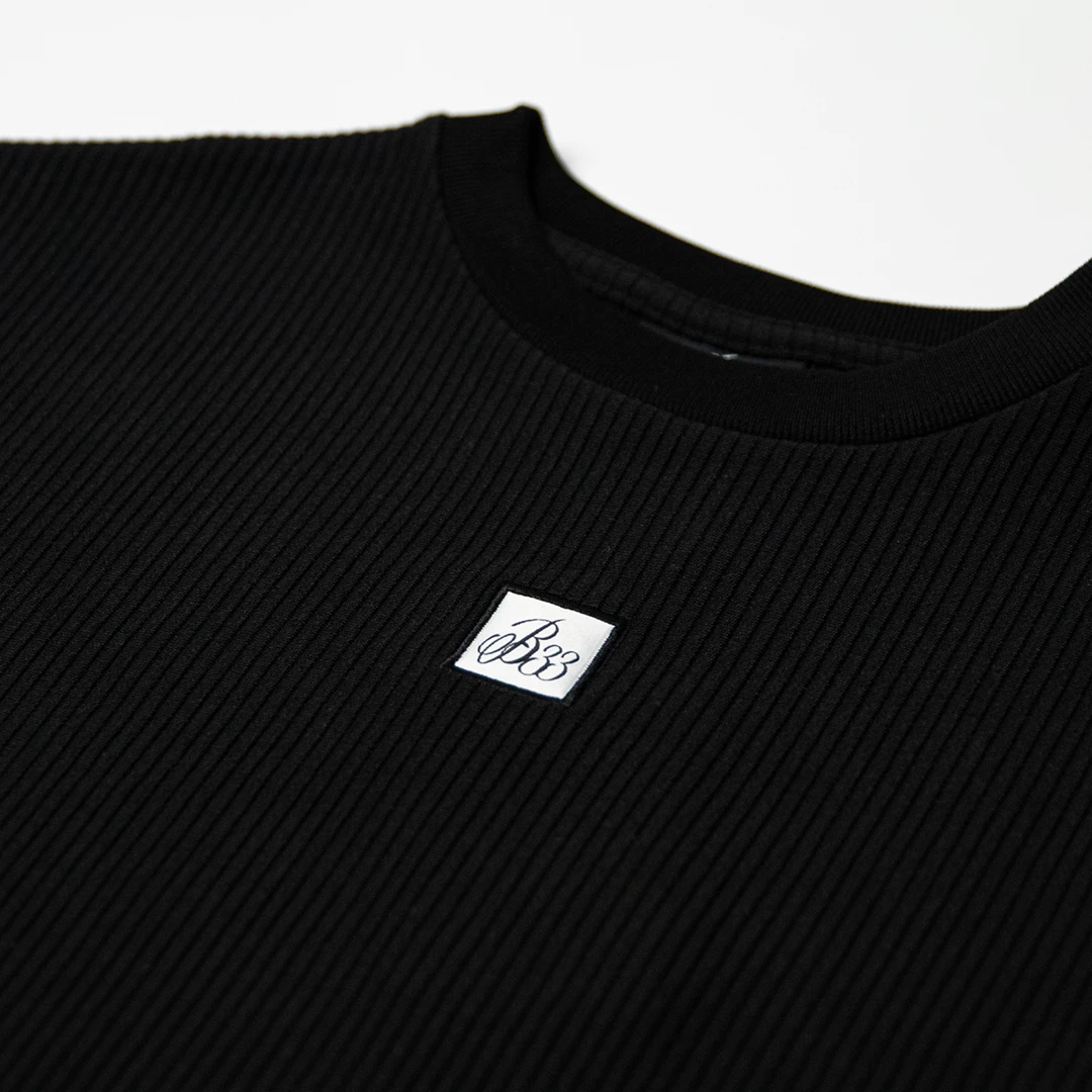 Our Level Up Rib Crop T-shirt is in a lightweight, ottoman material. Cropped to perfection, this tee has a round neckline, drop shoulder sleeves, and a loose hem. With our new B33 label with frame stitch on the centre front chest.